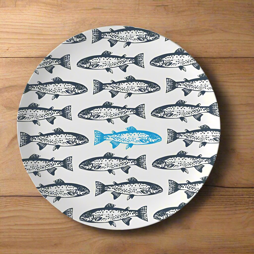 Elevate your dining experience with our stunning, signature fish dinner plates. Featuring a gentle shallow depression, each set includes four plates with two unique fish designs—two mackerel and two salmon. Choose from two sizes: Dinner Plates measuring 20.5 cm (8 inches) and Side Plates at 16.5 cm (6.5 inches).